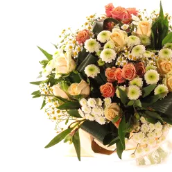 Состав букета : кустовые розы, зелень, упаковка,лента