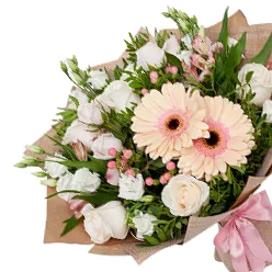 Состав букета: розы, альстромерии, зелень, упаковка, лента