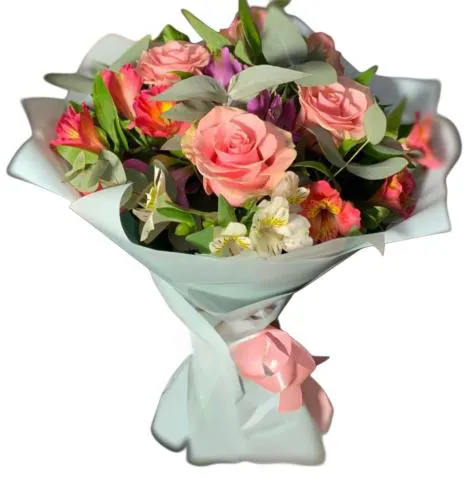 - Средний - кустовая роза - 5 шт., альстромерия - 7 шт.,упаковка,лента