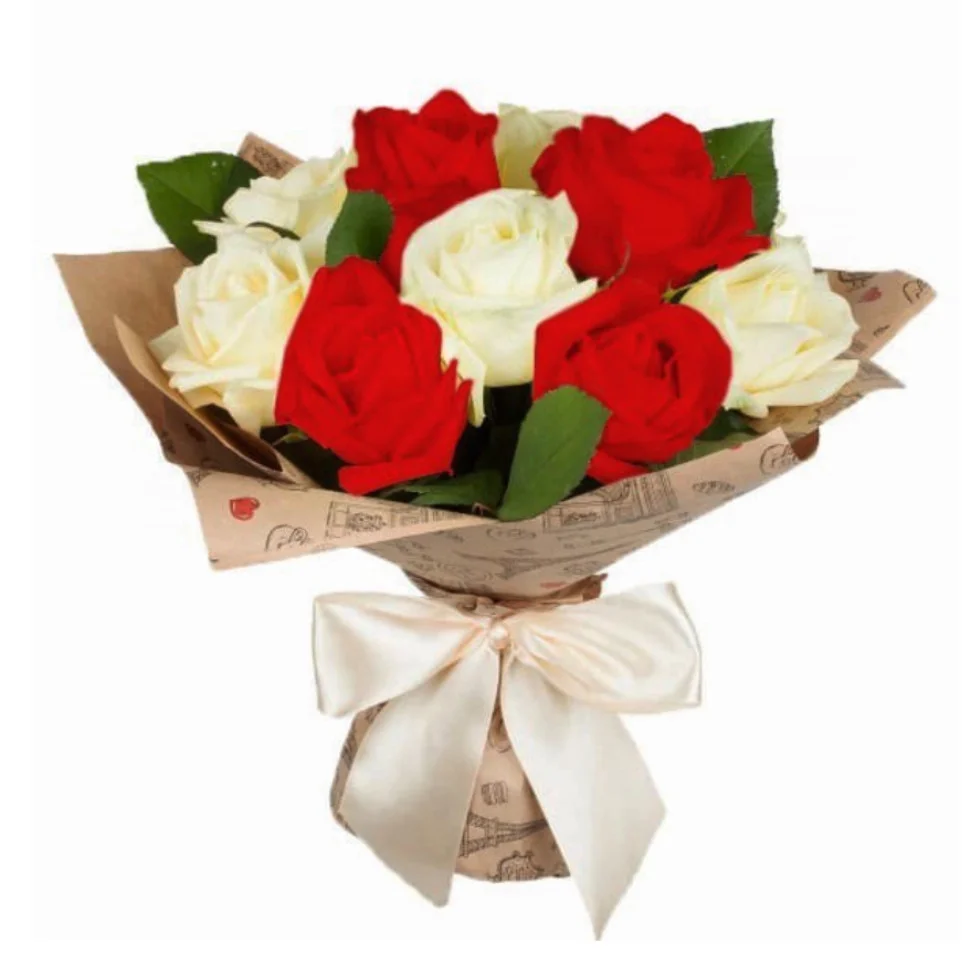 Красные и белые розы,упаковка,лента |