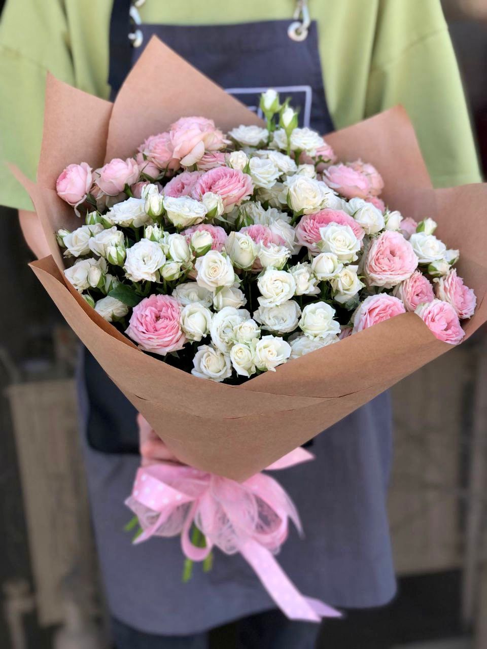 Такой романтичный и удивительный букет станет украшением любого праздника и обязательно поднимет настроение вашему близкому человеку. В данной композиции гармонично сочетаются кустовые розы белого и розового оттенков, которые умело гармонирую друг с другом. Розовые розы считаются символом искренних чувств, расположенности и надежды на удачное и стремительное развитие отношений. В то же время, белые цветы символизируют чистоту и искренность.