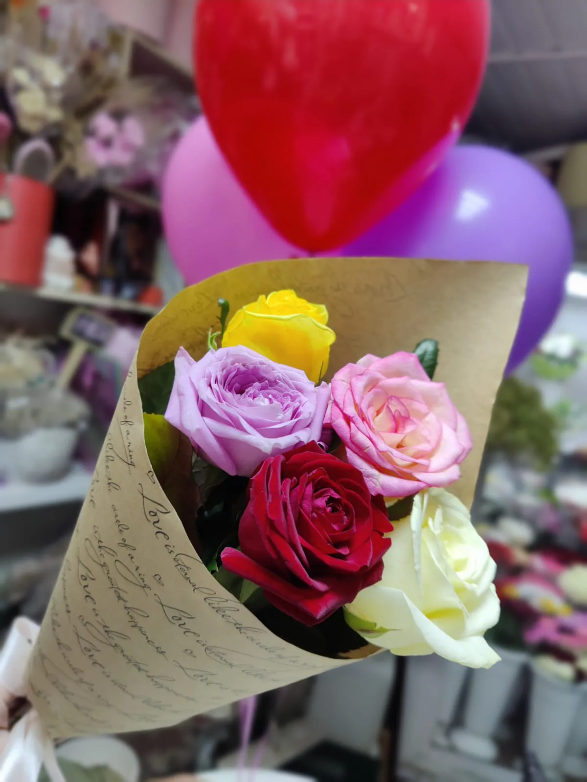 Состав букета: 5 ярких разноцветных роз, упаковка, лента
