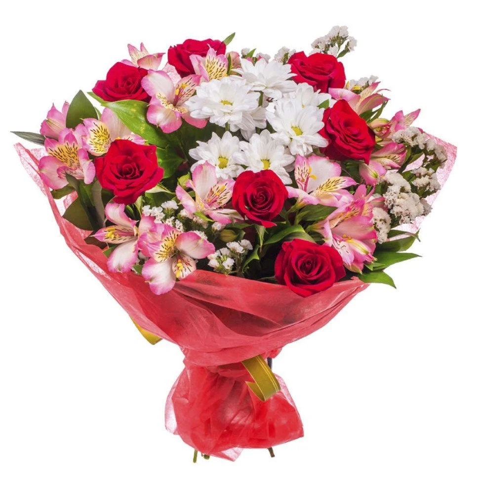 Преподнести великолепный букет из альстромерий, роз и хризантем – значит подарить любимому человеку прекрасное настроение на весь день!. Благодаря такому разнообразию цветов, букет выглядит более многогранным и подходит для любого праздничного события.