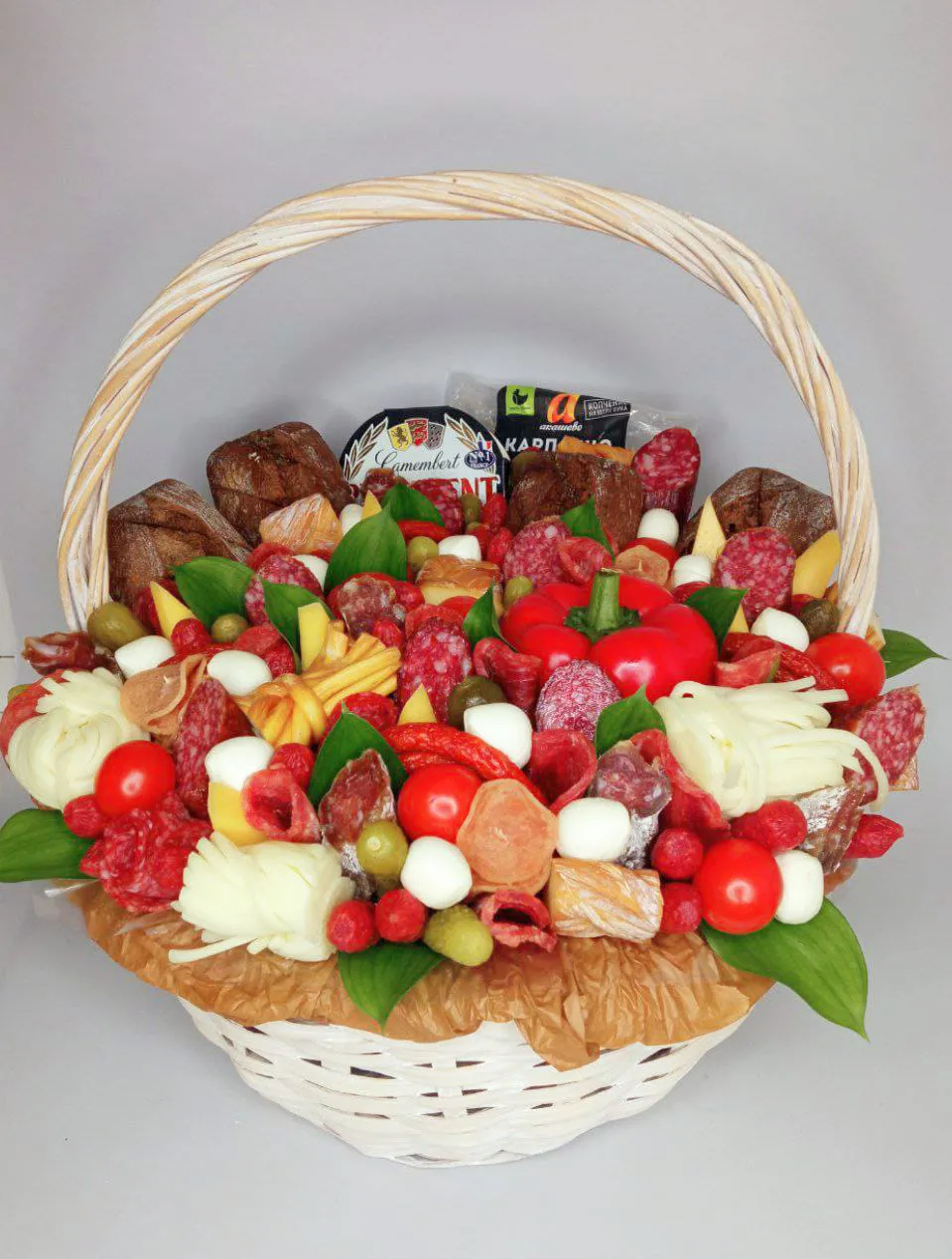 Состав: Сыр, черри, хлеб, перец, колбаса, колбаски ,корзина