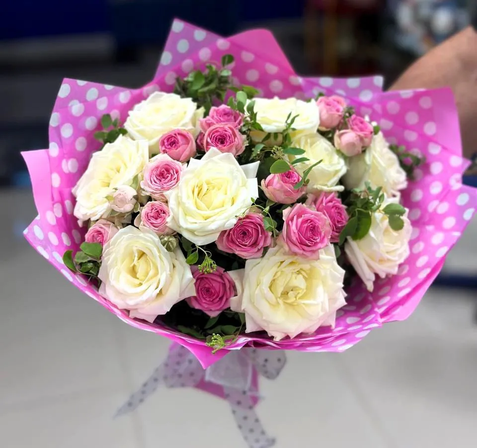 Погрузитесь в очарование этого роскошного букета, где пышные пионовидные розы встречаются с нежными кустовыми розами, создавая*симфонию красоты и утонченности.  Каждый бутон – это произведение искусства, излучающее романтику и элегантность. Идеальный подарок для выражения самых искренних чувств. Пионовидные розы*добавляют объем и богатство, а кустовые розы – легкость и нежность. Этот букет станет незабываемым подарком и наполнит день теплом и радостью.