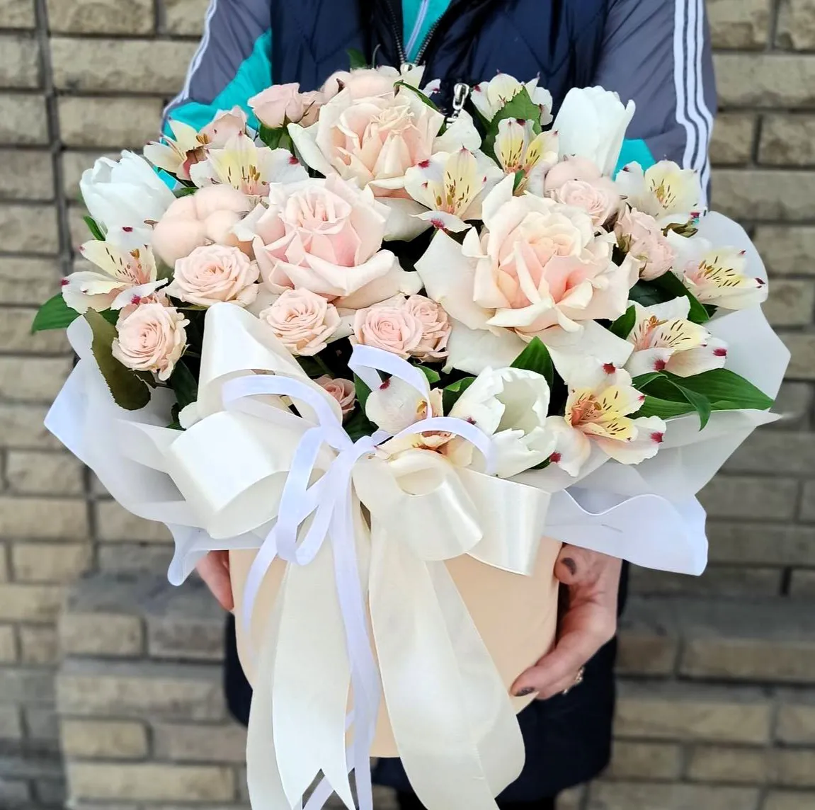 Эта шляпная коробка – не просто букет, это настоящее произведение искусства, которое способно украсить любой интерьер и привлечь восхищенные взгляды. Нежные пастельные оттенки цветов создают атмосферу уюта и радости, делая этот подарок подходящим для дня рождения, юбилея или особого события.