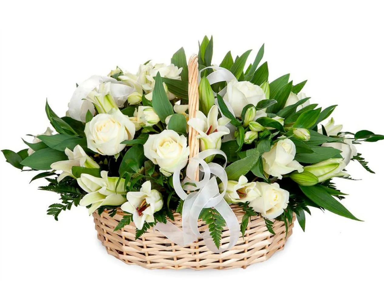 Состав: розы лилии, альстромерии, зелень, оазис, корзина