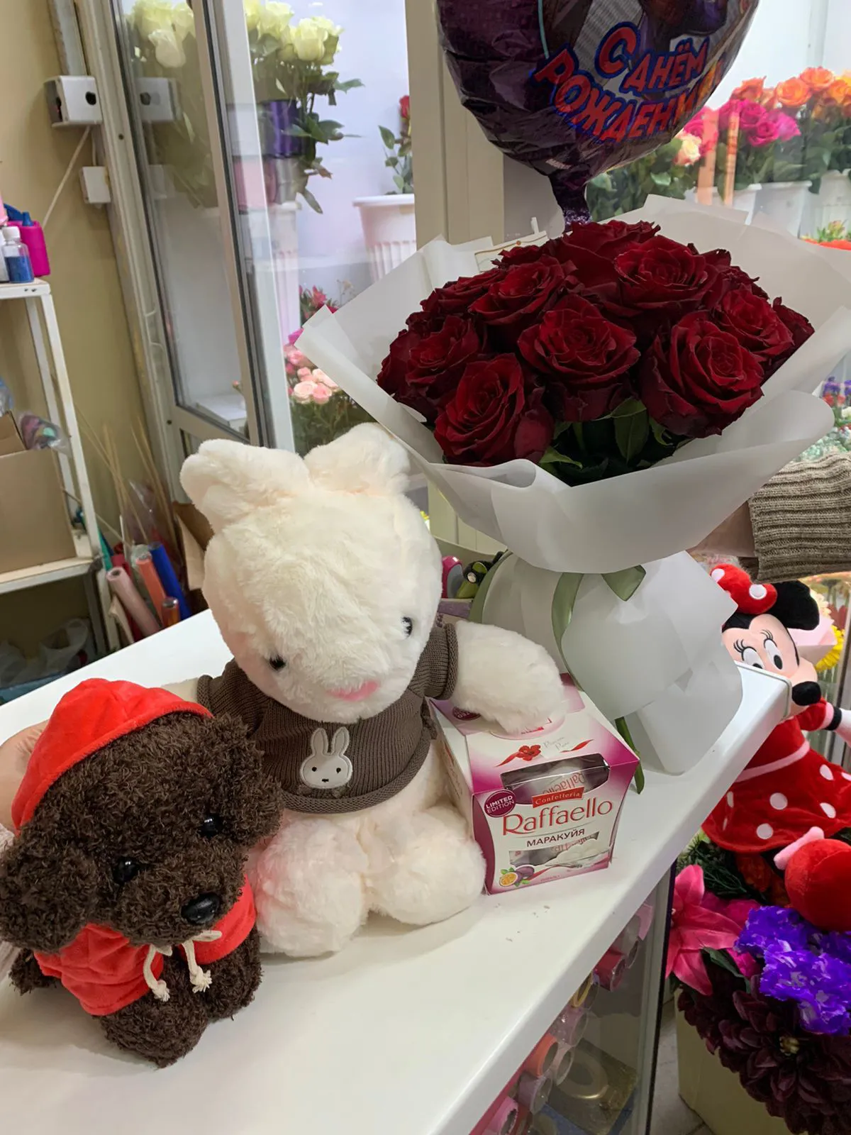• Средний - 15 роз, игрушка, Раффаэлло 150 гр.