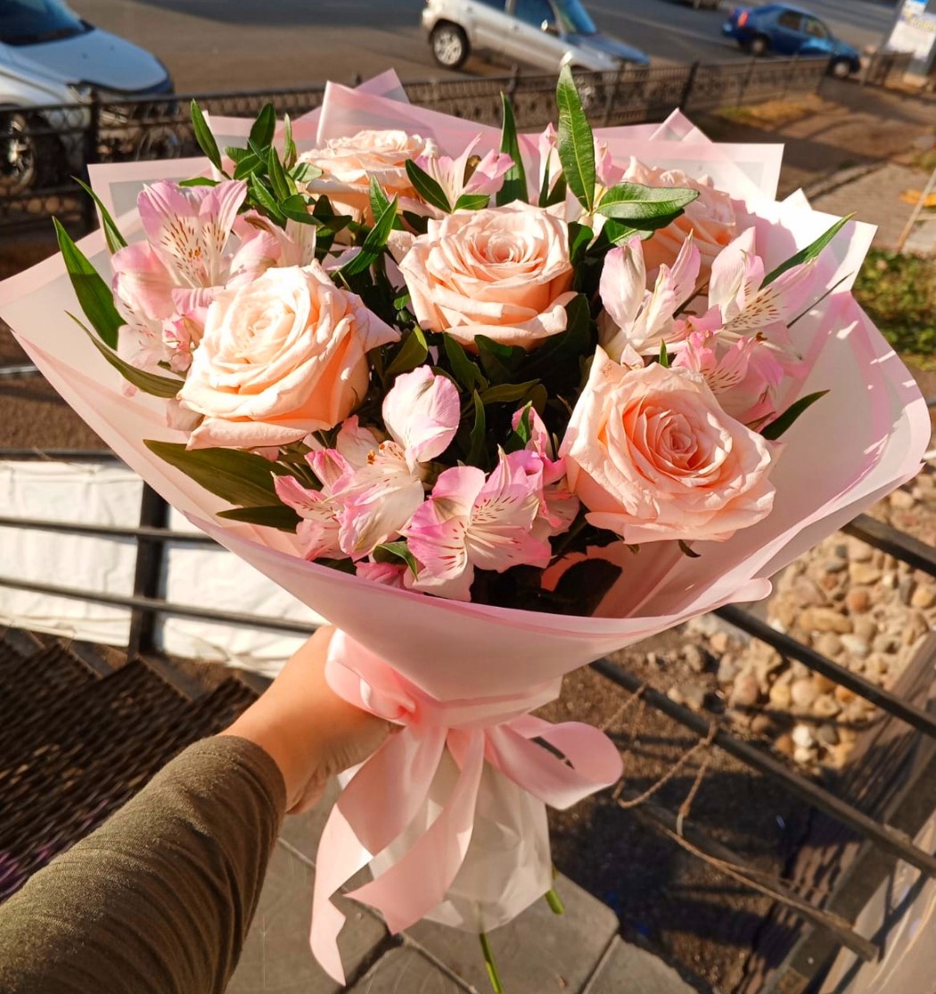 Букет из розовых роз и розовых альстромерий — это истинное олицетворение нежности и изящества. Каждый цветок в этом букете словно переплетается в гармоничном танце, создавая неповторимую симфонию цвета и аромата.