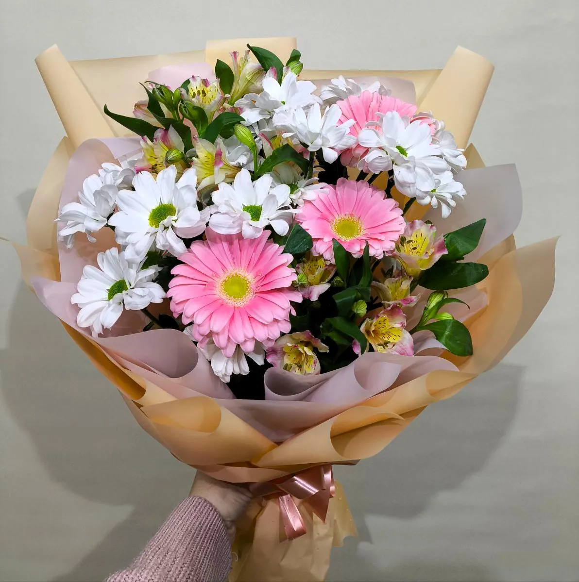 • Стандарт - гербера - 3 шт., хризантема - 2 шт., альстромерия - 3 шт., зелень, упаковка, лента