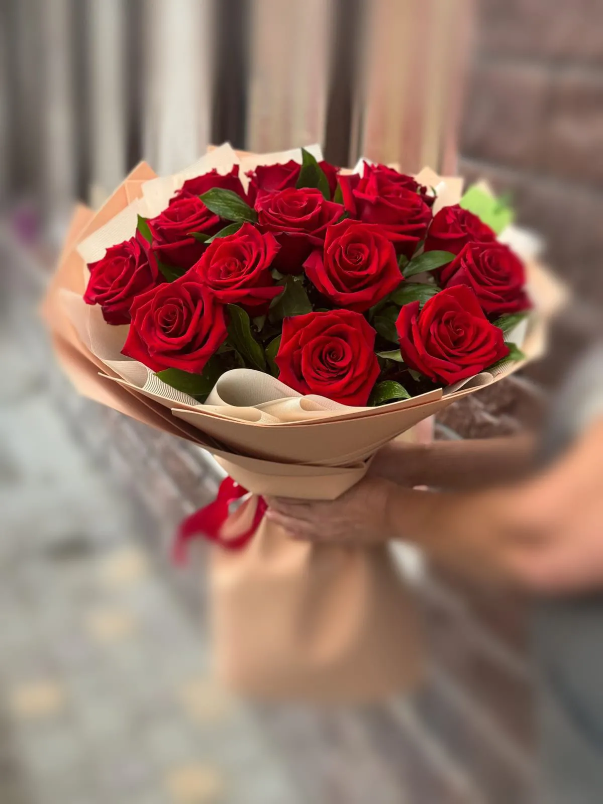 Розы, зелень, упаковка, лента |