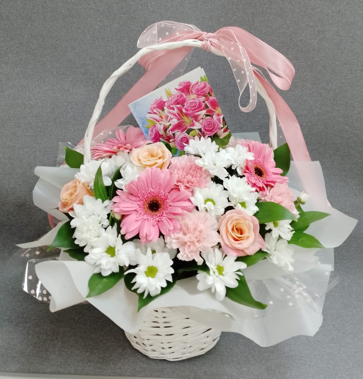 Эта композиция в корзине — настоящий праздник для глаз и души. Нежные кремовые розы, словно лепестки мягкого атласа, распускаются среди ярких розовых гербер, каждый из которых излучает энергии и радости. Гвоздики, с их изысканными формами и тонким ароматом, добавляют глубину и характер, создавая гармонию с белоснежными ромашковыми хризантемами, которые словно олицетворяют чистоту и невинность.