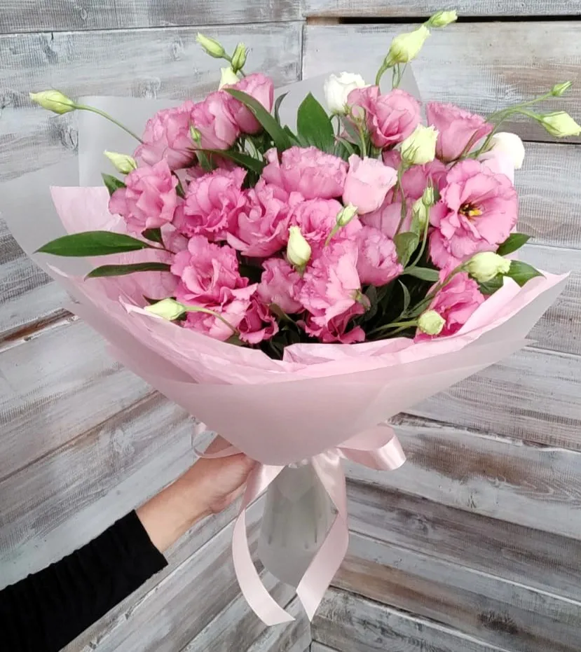 Эустома, зелень,упаковка, лента