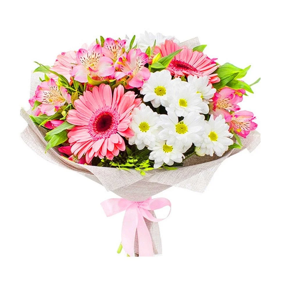 • Стандарт - гербера - 3 шт., хризантема - 2 шт., альстромерия - 3 шт., зелень, упаковка, лента